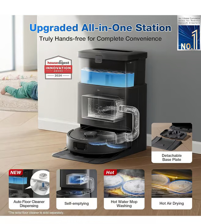 Smart mop automation: OZMO spinning pads with hot‑water washing (60 °C) and hot‑air drying (~40 °C), plus automatic mop‑pad lift on carpets